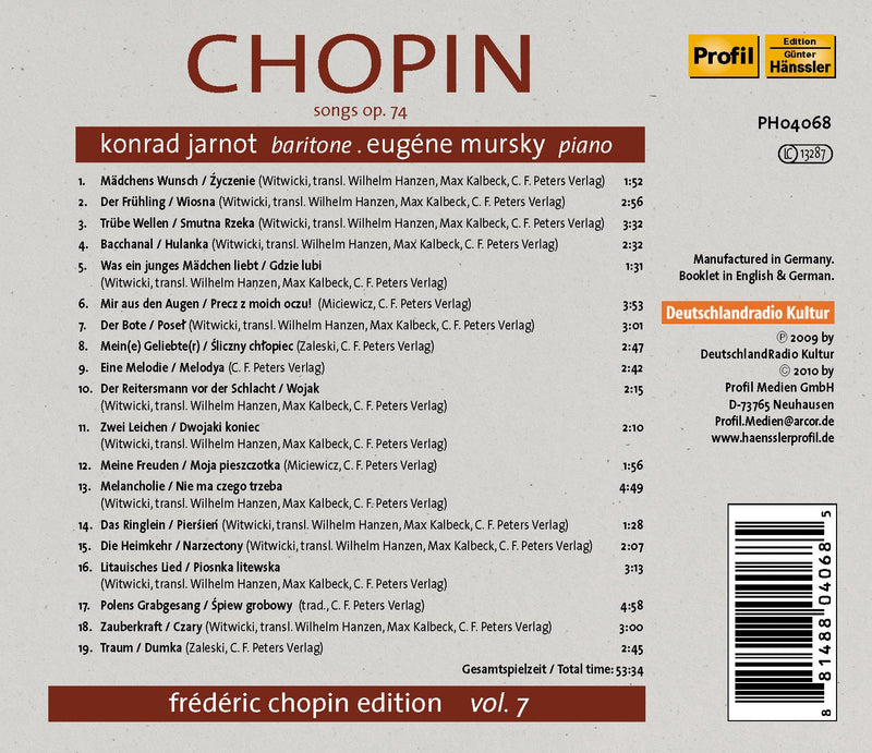 The two-compositions featured here, the Trio, op. 8 and the Sonata, op. 65, rank among the very few chamber music pieces Chopin...