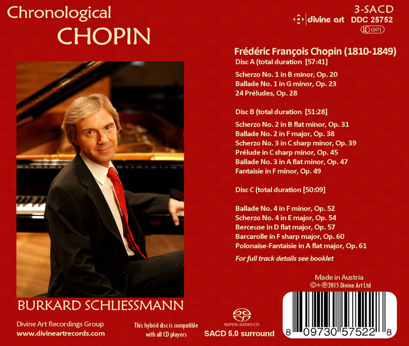 German pianist Burkard Schliessmann is a performer with a passion and vision, to seek out and interpret the forms, colors and textures, indeed the soul and expression: the poetic impact, of works we believe have already been fully explored. His previous recordings have received worldwide acclaim "Schliessmann is too good a pianist for anyone to pass on this" - American Record Guide; "without equal" - Fanfare. This triple SACD set with state of the art sound and luxury packaging chronicles the works of Chopin in order, showing the composer's development and is thus informative for scholars as well as being a superb recital. Chopin is the composer above all who has inspired Schliessmann and his interpretative style.