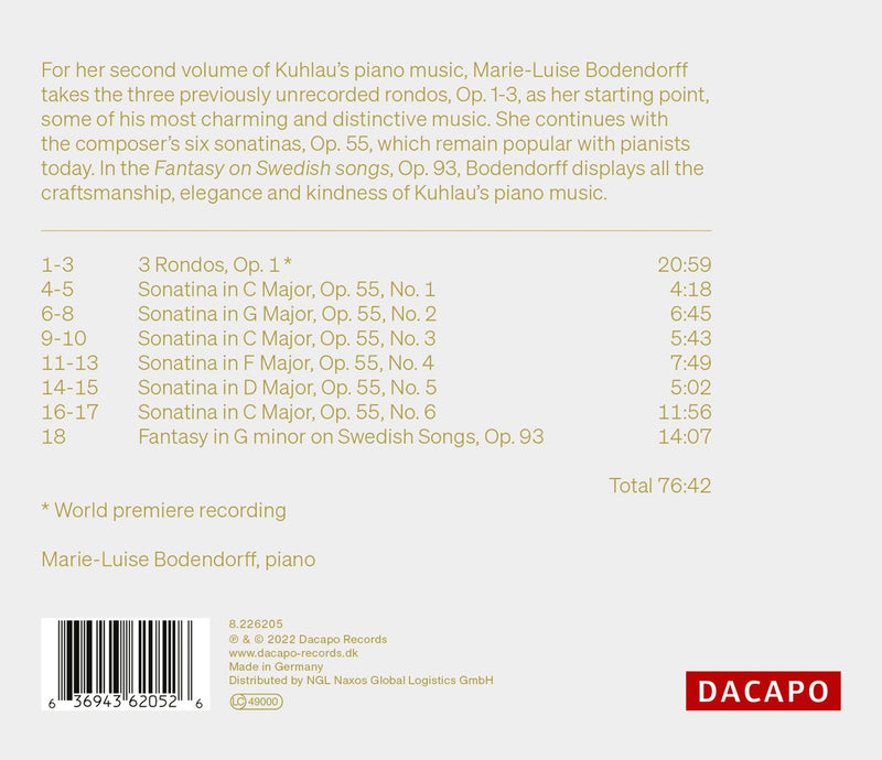 Dacapo ClassicalKuhlau: Works for Solo Piano, Vol. 2 / BodendorffFor her second volume of Kuhlau’s piano music, Marie-Luise Bodendorff takes the three previously unrecorded rondos, Op. 1, as her starting point,...