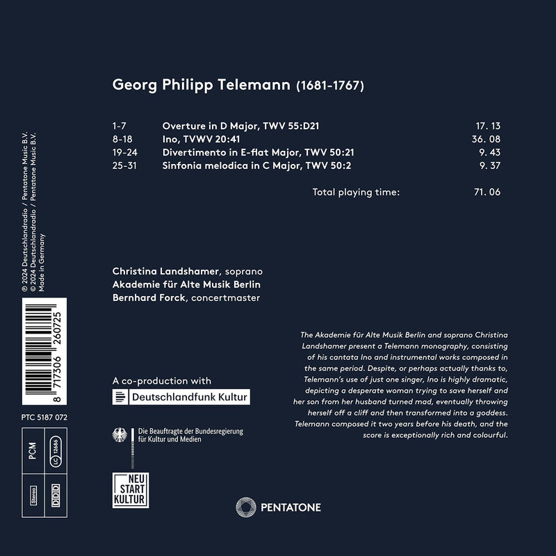 The Akademie für Alte Musik Berlin and soprano Christina Landshamer present a Telemann monography, consisting of his cantata Ino and instrumental works...