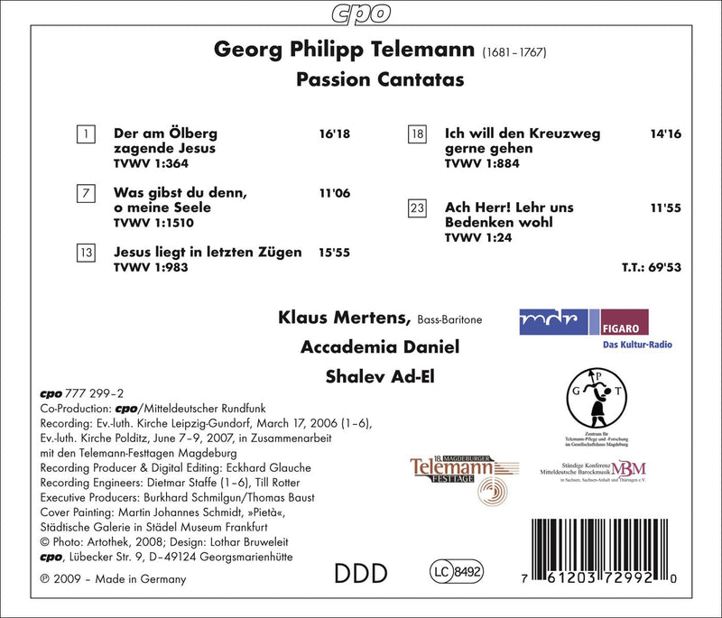 TELEMANN Passion Cantatas • Klaus Mertens (bbar); Shalev Ad-El, cond; Accademia Daniel (period instruments) • cpo 777 299 (69:53 Text and Translation)...