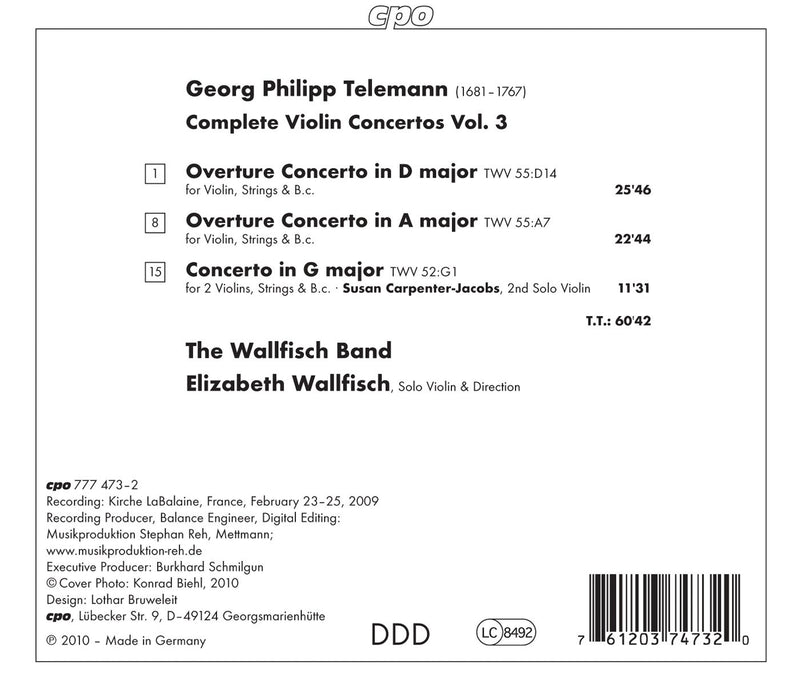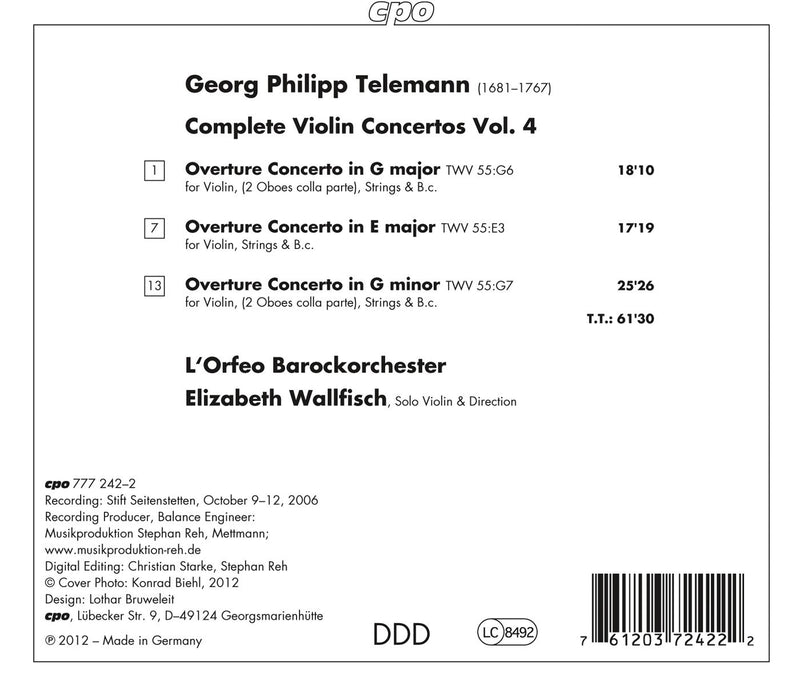 TELEMANN Overture Concertos: in G, TWV 55:G6; in E, TWV 55:E3; in g, TWV 55:g7 • Elizabeth Wallfisch (vn); dir; L’Orfeo Bar...