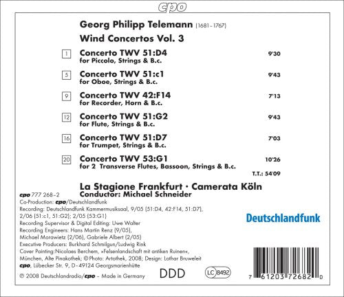 Includes concerto(s) for 2 flutes by Georg Philipp Telemann. Ensembles: La Stagione Frankfurt, Cologne Camerata. Conductor: Michael Schneider.Includes concerto(s) for oboe by...