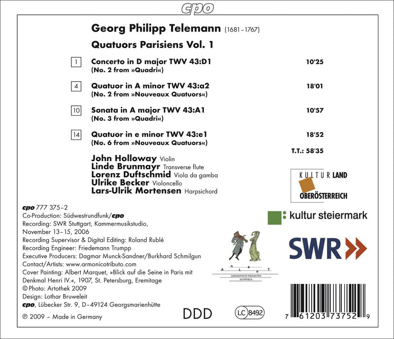 CPOTelemann: Quatuors Parisiens Vol 1 / Holloway, Brunmayr, Duftschmid, Becker, Mortensen