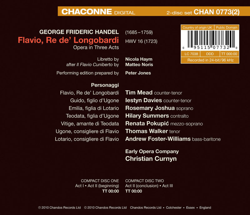 HANDEL Flavio • Christian Curnyn, cond; Tim Mead (Flavio); Rosemary Joshua (Emilia); Renata Pokupi? (Vitige); Hilary Summers (Teodata); Iestyn Davies (Guido); Thomas Walker (Ugone); Andrew Foster-Williams (Lotario); Early Opera Company (period instruments) • CHACONNE 0773 (2 CDs: 146:23 Text and Translation)