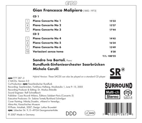 The piano works on this CD date from different periods in Gian Francesco Malipiero’s creative life. From his unpublished juvenilia to the...