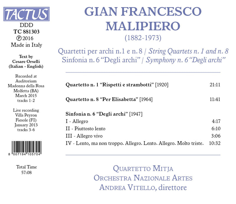 TactusMalipiero: String Quartets Nos. 1 & 8 and Sinfonia No. 6