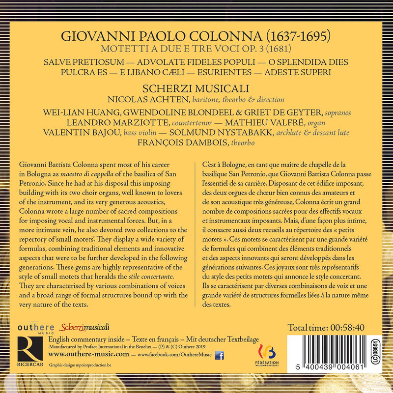 Giovanni Battista Colonna spent most of his career in Bologna as maestro di cappella of the basilica of San Petronio. Since he had at his disposal this imposing building with it's two choir organs, well known to lovers of the instrument, and it's very generous acoustics, Colonna wrote a large number of sacred compositions for imposing vocal and instrumental forces. But, in a more intimate vein, he also devoted two collections to the repertory of 'small motets.' The pieces recorded here come from the 1681 set of Motetti a due e tre voci. They display a wide variety of formulas, combining traditional elements and innovative aspects that were to be further developed in the following generations. These gems are highly representative of the style of small motets that heralds the stile concertante. They are characterized by various combinations of voices (from a solo recitative to a mixture of vocal duets or trios in different scorings) and a broad range of formal structures bound up with the very nature of the texts.