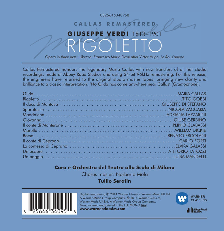 WARNER CLASSICSRIGOLETTO (1955)2014 Maria Callas re-mastered series reissue. With this Abbey Road 24-bit 96kHz re-master, engineers returned to the original master tapes, bringing new...