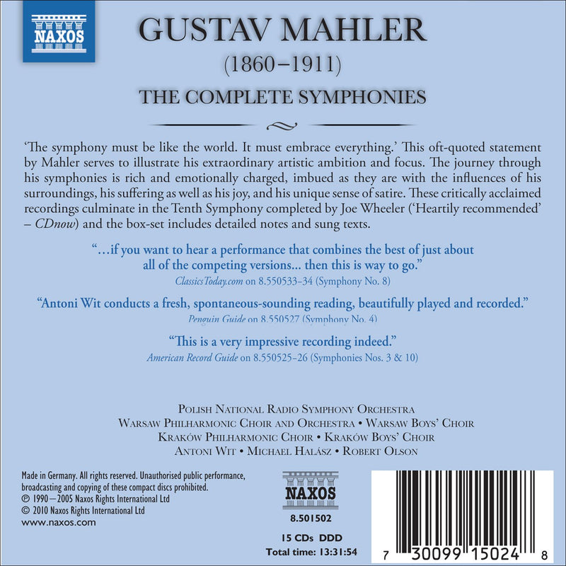 ‘The symphony must be like the world. It must embrace everything.’ This oft-quoted statement by Mahler serves to illustrate his extraordinary artistic ambition and focus. The journey through his symphonies is rich and emotionally charged, imbued as they are with the influences of his surroundings, his suffering as well as his joy, and his unique sense of satire. These critically acclaimed recordings culminate in the Tenth Symphony completed by Joe Wheeler (‘Heartily recommended’ – CDnow) and the box-set includes detailed notes and sung texts.