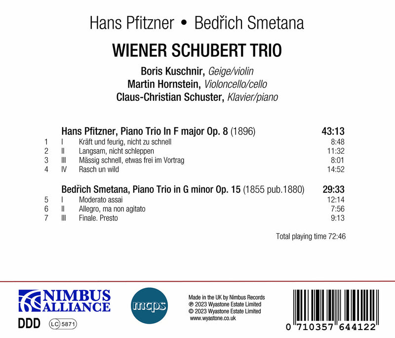 On SaleNimbusPfitzner & Smetana: Works for Piano Trio / Wiener Schubert TrioHans Pfitzner (1869-1949) and Bedrich Smetana (1824-84) hold special places in music history as ardent nationalist composers and creators of significant stage...