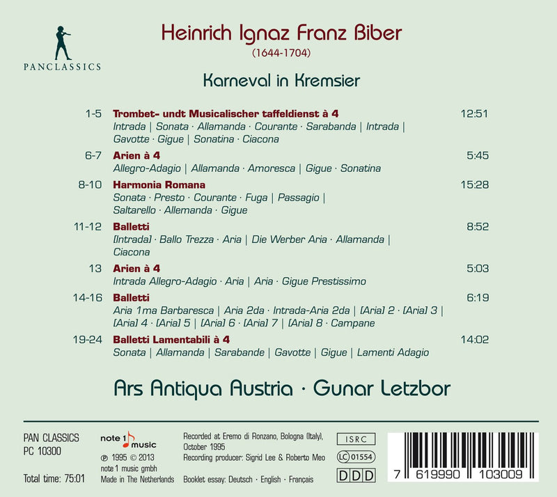 Pan ClassicsHeinrich Ignaz Franz Biber: Karneval In KremsierThe violinist Gunar Letzbor is an established specialist in performing Austrian baroque music; in particular, he has especially intensively grappled with works...