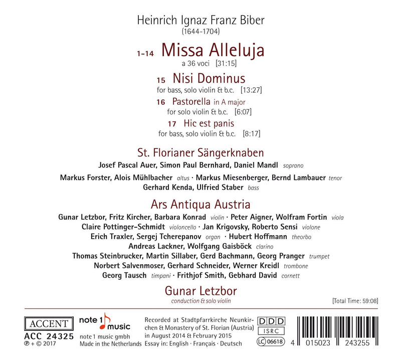 AccentBiber: Missa Alleluja / Letzbor, Ars Antiqua Austra, St. Florianer SangerknabenSeveral masses with large orchestration attest to the outstanding compositional skills of the Salzburg master Heinrich Ignaz Franz Biber (1644-1704) in coping...