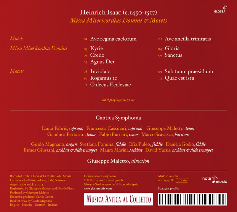 GlossaHeinrich Isaac: Missa Misericordias Domini & MotetsThe influence of the Franco-Flemish Renaissance composer Heinrich Isaac extends into today with his extraordinarily prolific output. The period ensemble, Cantica Symphonia...