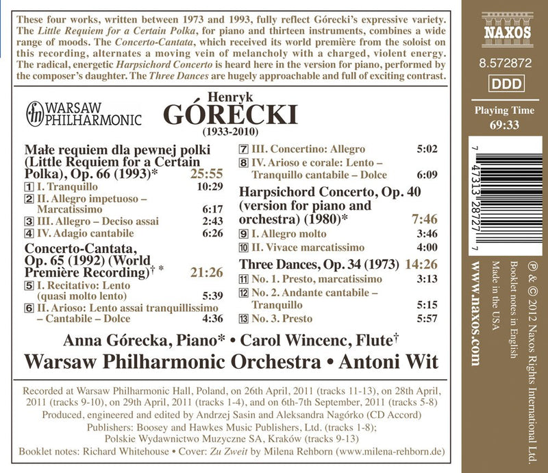 These four works, written between 1973 and 1993, fully reflect Górecki’s expressive variety. The Little Requiem for a Certain Polka, for piano...
