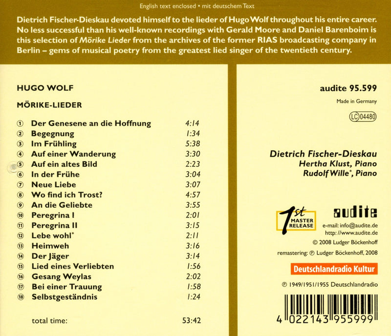 Audite MusikproduktionFischer-Dieskau Edition Vol 1 - Hugo Wolf: Morike Lieder / Klust, WilleWith the present recording the thirty-year-old Fischer-Dieskau demonstrates his subtle art of textual exegesis, bathed in the dolcezza and suavity of his...