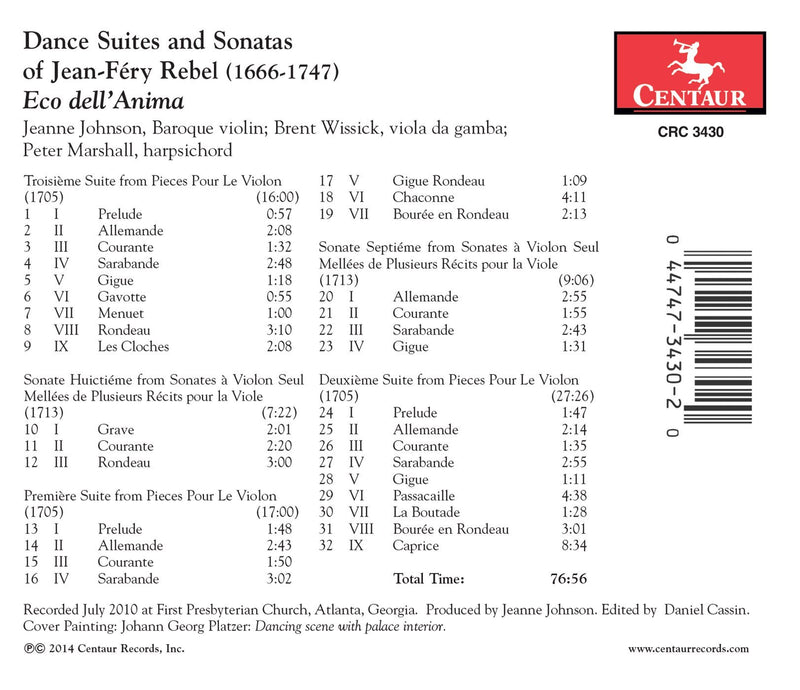 Jean-Fery Rebel (1666-1747) was a noted violinist, conductor, composer and harpsichordist. He was appointed court chamber composer to Louis XV in 1787. All works are performed by Eco dell’Anima on period instruments.