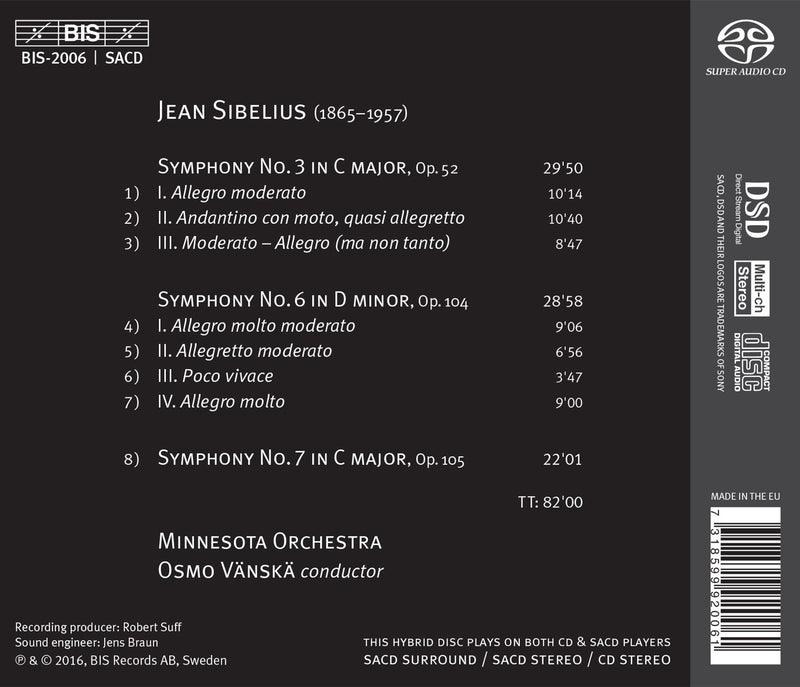 BISSibelius: Symphonies Nos. 3, 6 & 7 / Vanska, Minnesota Orchestra