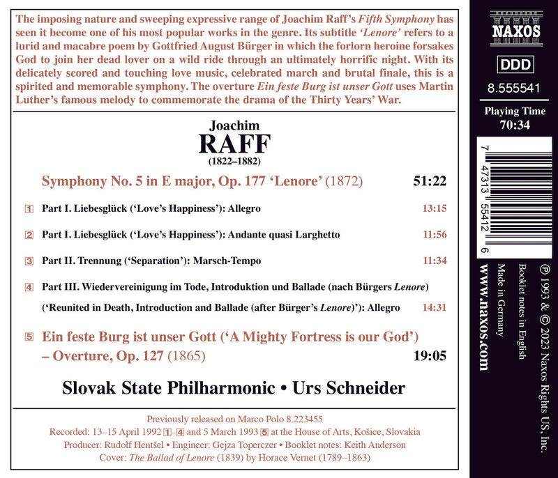 NaxosRaff: Symphony No. 5, "Lenore" / Schneider, Slovak State PhilharmonicPreviously released on Marco Polo (8.223455). Joachim Raff’s Fifth Symphony is one of his most popular works in the genre. The overture...