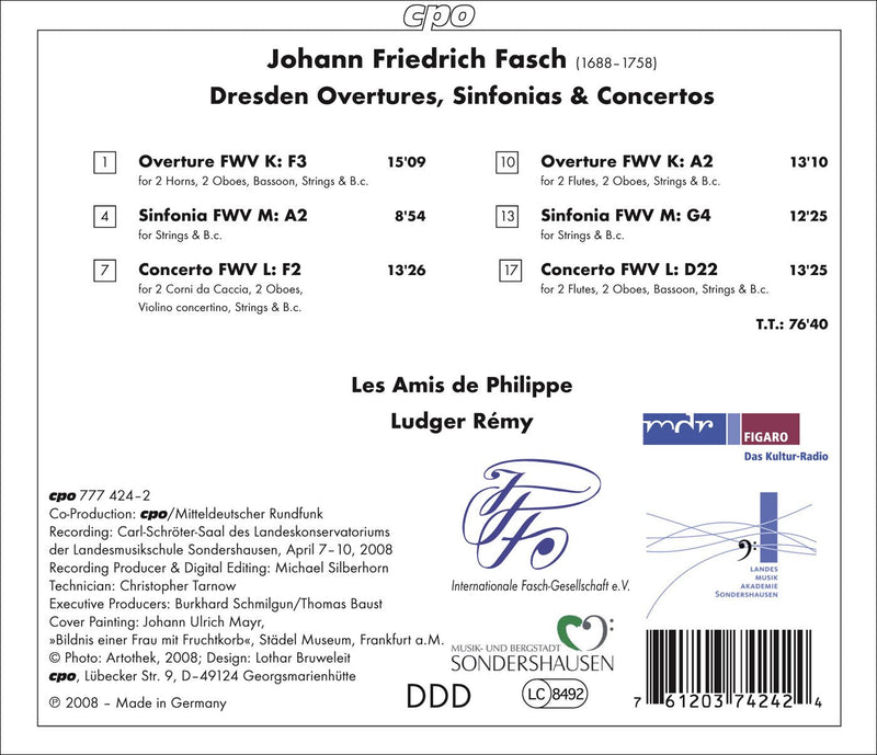 CPOFasch: Dresden Ouvertures, Sinfonias & Concertos / Remy, Les Amis De Philippe