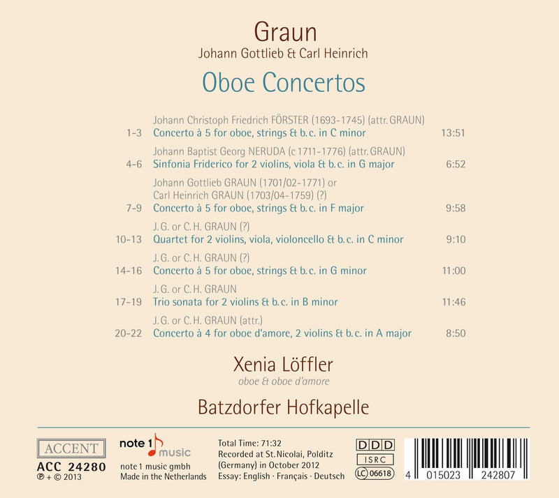 Johann Gottlieb Graun became a member of the small court orchestra of the Prussian Crown Prince Frederick in Ruppin in 1732, which Carl Heinrich also joined in 1735. With Friedrich's ascension to the throne in 1740, Johann Gottlieb was appointed concertmaster and Carl Heinrich kapellmeister of the royal court. Johann Gottlieb remained until the end of his life closely linked to Frederick the Great, as concertmaster and chamber musician. Whilst his brother Carl Heinrich became an important figure at the new Berlin Court Opera, Johann Gottlieb strongly influenced the musical life of Berlin and early classicism in general as a violinist and composer. One can no longer determine with any certainty which of the brothers wrote the oboe concertos recorded here - the existing sources are too unclear and the differences in their personal styles are too slight. What is certain, however, is that the name 'Graun' was a kind of seal of approval in those days for zestful music rich in ideas - an estimation still valid today, as is readily apparent when listening to these concertos. The oboist Xenia Löffler has distinguished herself as a specialist for the North German repertoire of this period, as in her recordings with oboe concertos from the Dresden Court and with works from the Dresden Pisendel Collection (ACC 24202 and 24222). Alongside her teaching activities at the Academy of the Arts in Bremen, she is a member of the Akademie für Alte Musik Berlin and in great international demand as a soloist.