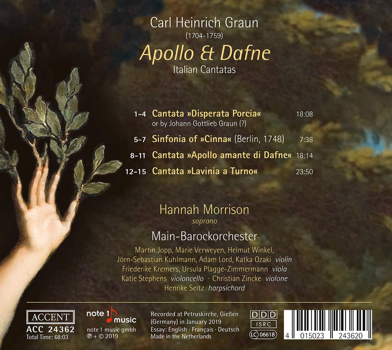 Carl Heinrich Graun, like other Italian-influenced or Italian-trained German composers of his time, composed Italian cantatas throughout his entire creative period. The three cantatas belong to a small group in Graun’s output, for soprano. The greater part of his 38 positively attributed Italian cantatas were composed for tenor, and thus probably for his own voice. Graun's soprano cantatas were probably written in his Berlin years after Friedrich's accession to the throne in 1740, when virtuoso castrati and singers were available for the demanding solo parts. After successful albums with music by Fasch, Hertel and Molter, the ensemble Main-Barockorchester has now joined the Accent label. Hannah Morrison is regarded as one of the most promising young sopranos of the early music scene.