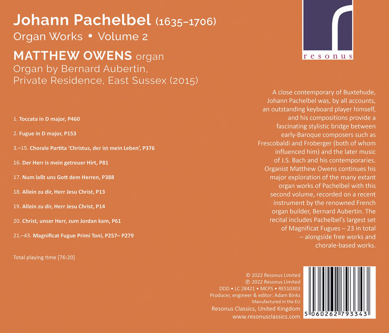 Johann Pachelbel played an important role in the history of keyboard music in Germany in the late 17th and early 18th centuries. As teacher of Johann Sebastian Bach's eldest brother Johann Christoph he has substantially contributed to the development of the younger Bach as a composer of keyboard music. His chorale arrangements and partitas are regularly played by organists, but until recently there was no really good complete recording of his keyboard music. That has changed with the CPO project of which the present set is the second instalment. The first volume included five discs, and after these two there are three more to come.