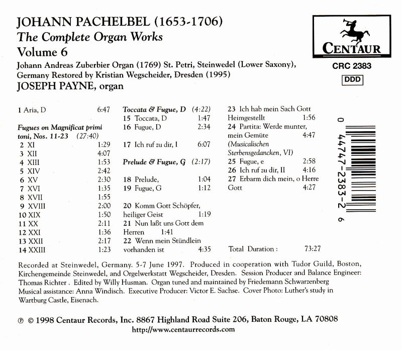 Fugues take an important place in Pachelbel's oeuvre, as the track-list shows. In contrast to common practice for most of the 17th century, in his oeuvre preludes and toccatas on the one hand and fugues on the other are formally separated. That was also to be the case later in Bach's oeuvre. However, whereas in the latter's output those are mostly connected, in Pachelbel's oeuvre we find quite a number of independent fugues. In this recording they are mostly connected by the performers to a prelude or a toccata.