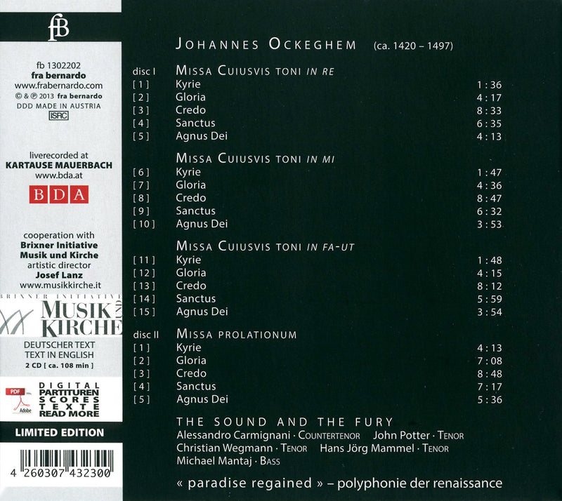 OCKEGHEM Missa cujusvis toni. Missa prolationum • The Sound and the Fury • FRA BERNARDO 1302202 (2 CDs: 107:54) Johannes Ockeghem (c.1420–1497)...