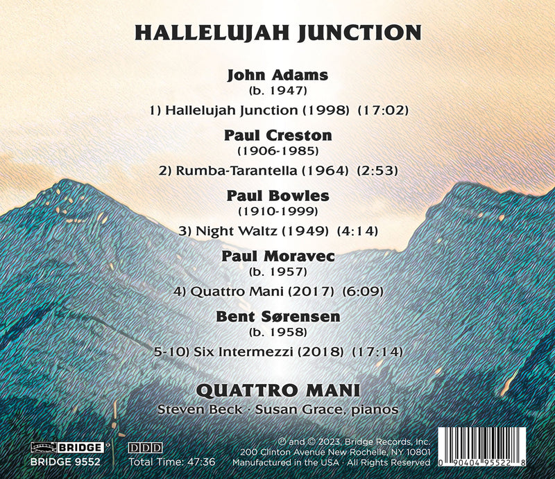 Bridge RecordsHallelujah Junction / Quattro Mani DuoStellar piano duo Quattro Mani's latest recording features John Adams's ebullient "Hallelujah Junction", and premiere recordings by Paul Moravec and Danish composer...