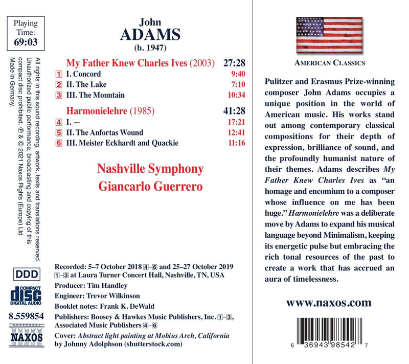 On SaleNaxosAdams: My Father Knew Charles Ives; Harmonielehre / Guerrero, Nashville SymphonyA 2021 GRAMMY Nominee for Best Orchestral Performance! Pulitzer and Erasmus Prize-winning composer John Adams occupies a unique position in the world...