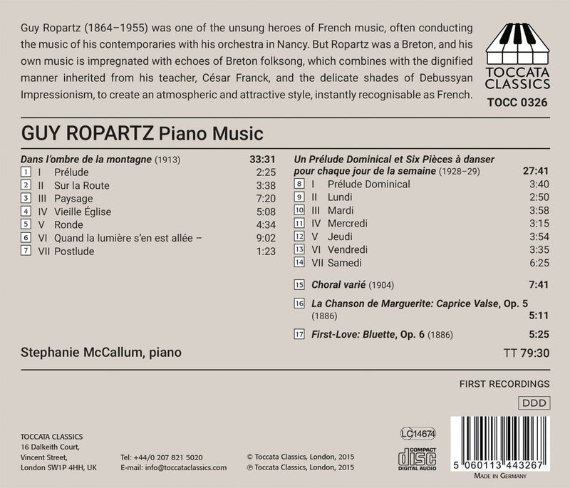 These are winning performances, warmly recorded, and make a strong case for both the attractiveness and quality of this composer’s music. Stephanie McCallum’s enthusiastic advocacy adds to the success of the mix. Peter McCallum’s detailed annotations, in English only, provide fascinating and informative background. Will there be any more of Ropartz’s piano music to come? Let's keep our fingers crossed.