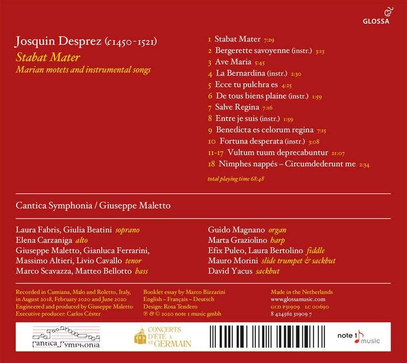 GlossaDesprez: Stabat Mater - Marian Motets / Giuseppe Maletto, Cantica Symphonia