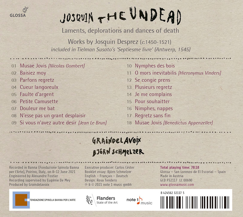 GlossaJosquin, the Undead - Laments, deplorations and dances of death / Schmelzer, GraindelavoixBjörn Schmelzer and his ensemble provide their special vision in this Josquin Desprez anniversary. With the conviction that Josquin, during his late...