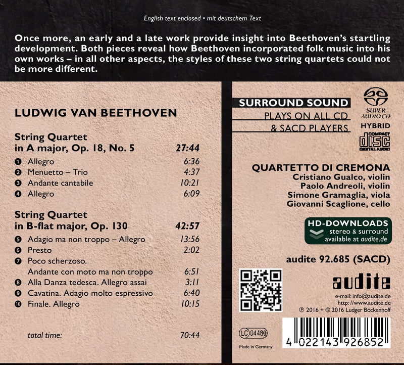 Following the successful release of Volume I in the complete edition of Beethoven String Quartets with the 'Quartetto di Cremona', audite now...