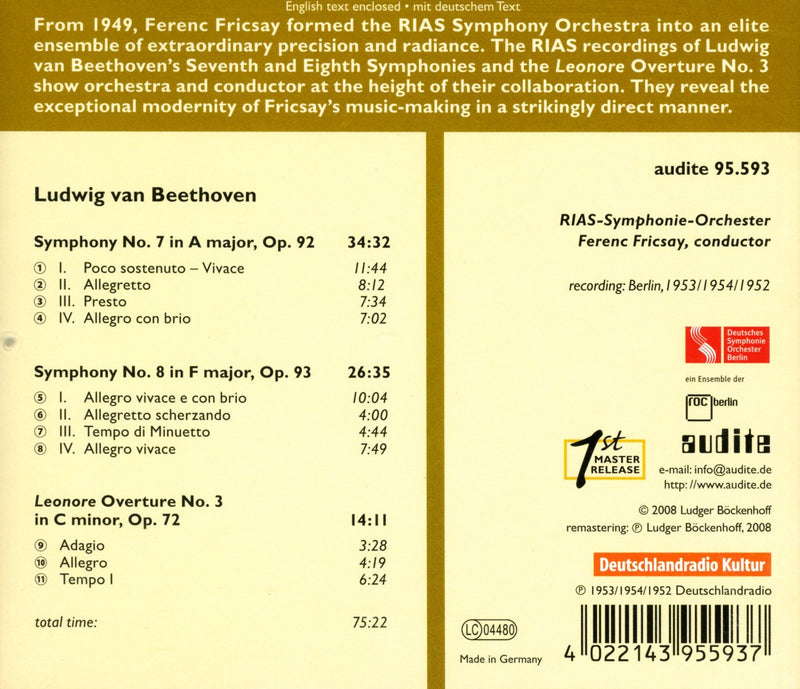 BEETHOVEN Symphonies: No. 7; No. 8. Leonore Overture No. 3 • Ferenc Fricsay, cond; Berlin RIAS SO • AUDITE 95.593, mono (75:22)...