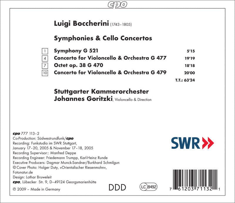 CPOBoccherini: Symphonies & Cello Concertos / Johannes Goritzki, Et AlRecording information: Funkstudio im SWR Stuttgart (01/17/2005-01/20/2005); Funkstudio im SWR Stuttgart (11/17/2005-11/18/2005).