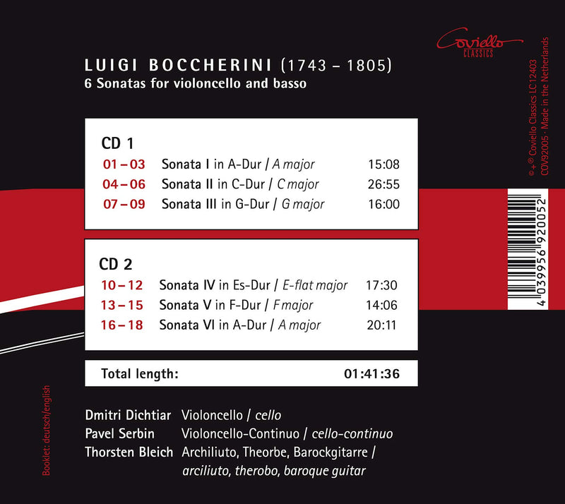 CovielloKLANGPANTOMIMELuigi Boccherini's six sonatas for violoncello and bass, published in London around 1770/1775, are technically quite demanding pieces. The baroque cellist Dmitri...