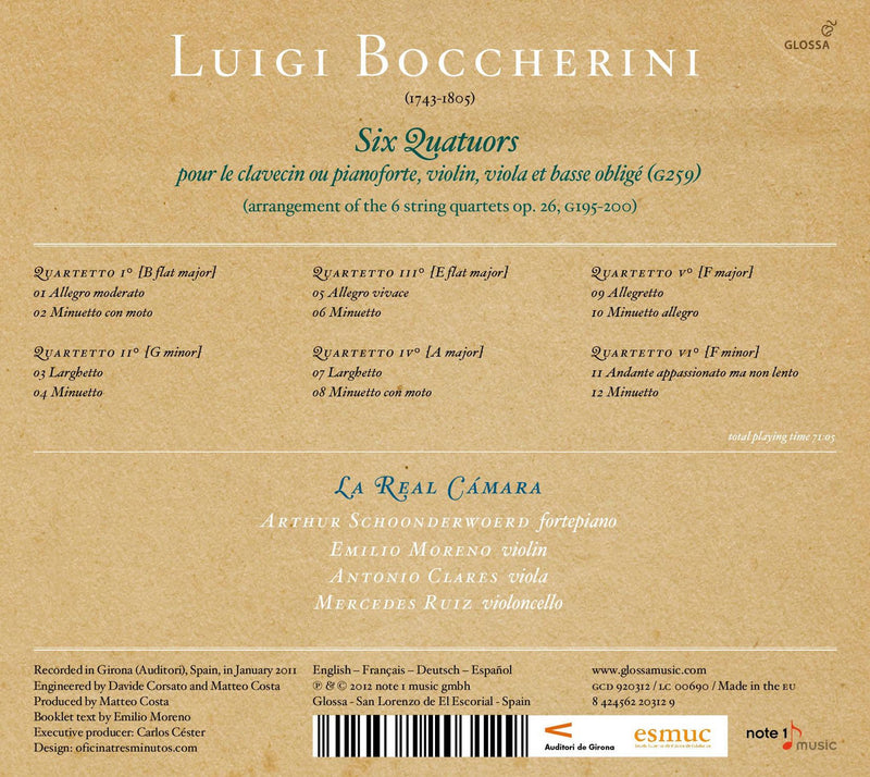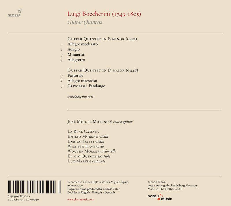 Boccherini’s guitar quintets are arrangements prepared from material originally used in a cycle of piano quintets, written in Madrid during the final...