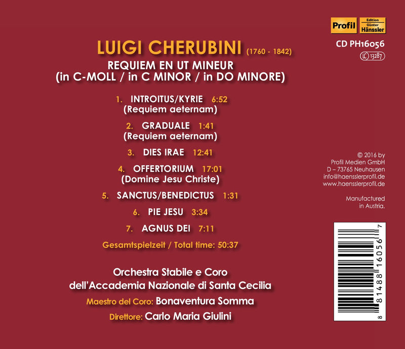 ProfilCherubini: Requiem Mass / GiuliniIn the post-war gramophone record era, the great conductor Arturo Toscanini was the first to record the work on February 19, 1950....