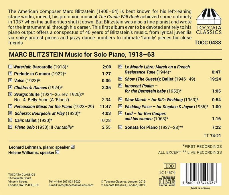The American composer Marc Blitzstein (1905-64) is best known for his left-leaning stage works; indeed, his pro-union musical The Cradle Will Rock achieved some notoriety in 1937 when the authorities shut it down. But Blitzstein was also a fine pianist and wrote for the instrument all through his career. This first album ever devoted entirely to his piano output offers a conspectus of 45 years of Blitzstein's music, from lyrical juvenilia via spiky protest pieces and jazzy dance numbers to intimate 'family' pieces for close friends. The pianist is the Blitzstein expert Leonard Lehrman, whom Leonard Bernstein called 'Blizstein's dybbuk', and who for decades has been one of the leading Blitzstein scholars.