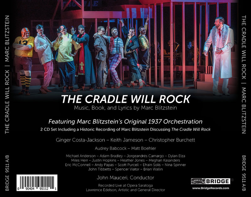 The opening night of Marc Blitzstein’s The Cradle Will Rock was one of the most infamous in history. The attempt to shut down and censor the production resulted in an improvised performance with Blitzstein playing his score on the piano, which has influenced performances of this American masterpiece for decades. Now, this First Complete Recording of The Cradle Will Rock - recorded live at Opera Saratoga in July 2017 - restores Blitzstein’s brilliant original orchestrations to their full glory. Under the baton of conductor John Mauceri and direction of Lawrence Edelson, this remarkable production of the fable of Steeltown USA, corrupted at every social level by the predations and capitalist cupidity of its boss-man, Mr. Mister, was hailed by the Philadelphia Inquirer as having “no polite veneer to soften Blitzstein’s social outrage, with a cast that had the scrupulousness of opera but the theatricality of Broadway.” Straddling the worlds of opera, musical theater and popular music, The Cradle Will Rock is as timely and entertaining today as when it first premiered in 1937.