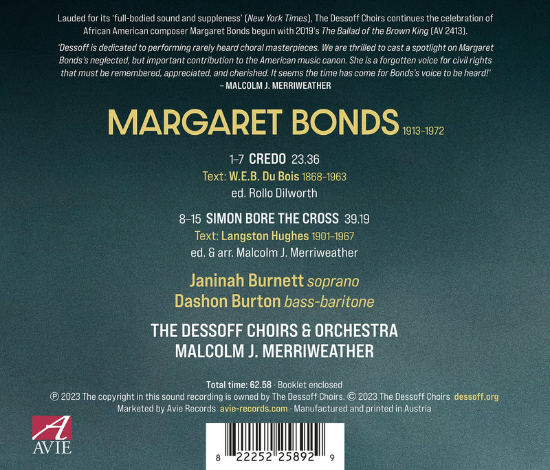 New York City-based The Dessoff Choirs, instrumental in re-establishing the music of 20th-century African American composer Margaret Bonds with the world-premiere recording of her Christmas oratorio, The Ballad of the Brown King, present two more Bonds premieres: new orchestrations of her cantata, Simon Bore the Cross, created with long-time collaborator and friend Langston Hughes, and the large-scale Credo set to prose by W.E.B. Du Bois. Akin to The Ballad of the Brown King, which centered around the dark-skinned king Balthazar who journeyed to Bethlehem to witness the birth of Jesus Christ, Bonds' and Hughes' North African Simon carried Jesus's cross on the way to Calvary, giving African American audiences an opportunity to see themselves within the biblical canon. Credo bears Bonds' evocative vocal writing style infused with elements from various black musical genres. The first complete performance of the work was given in 1973, to rave reviews: "Credo verified her talent, her sensitivity, her proficiency as orchestrator and her concern for the Negro spiritual" (Los Angeles Times). Written during the last decade of Bonds' life, neither work was performed in its entirety during the composer's lifetime. With this release – coinciding with Black History Month – conductor Malcolm J. Merriweather, The Dessoff Choirs and Orchestra and soloists, soprano Janinah Burnett and bass-baritone Dashon Burton, bring Margaret Bonds' beautiful and spiritual music back to life, conveying a powerful message that remains poignant and relevant for music lovers today.