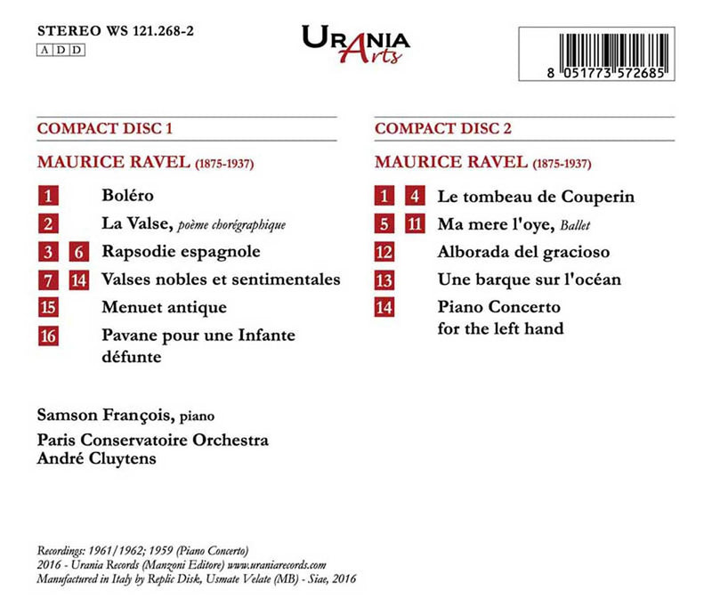Urania RecordsRavel: Orchestral WorksThese recordings dating from 1961-1962 have been reproduced and remastered beautifully for this release. The Orchestral works of Ravel conducted by Andre...