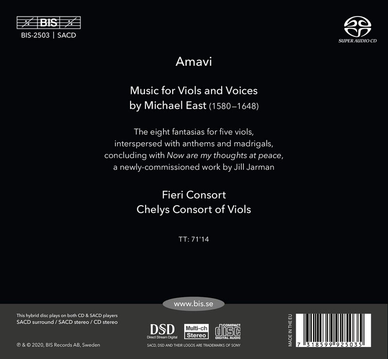 Running through this album is a path from despair and sin through revelation, repentance and belief, to life, triumph and finally love. The stations on the way are eight five-part fantasias for viols by Michael East (1580–1648), unusual in that each of them has a Latin title – from Desperavi to Amavi. In his time, East was one of England’s most published composers with seven books of his compositions in print, all of them containing music for viols and voices. The fantasias are here performed by the five members of Chelys Consort of Viols, who together with the singers in Fieri Consort have selected vocal items by East to complement each of the instrumental pieces. Regretting the lack of modern repertoire for this combination the performers have also commissioned a new piece by the composer Jill Jarman. Setting a verse by Sir Henry Wotton, a contemporary of East, Now are my thoughts at peace sums up the journey of the fantasias from Desperavi to Amavi, 400 years after they were written.