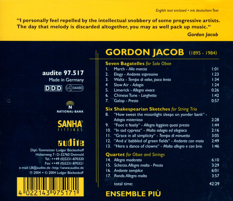 NaxosJacob: Chamber Music with RecorderWith some notable exceptions, professional recorder players have largely ignored modern repertoire regarded as being too tonal, melodic or romantic.