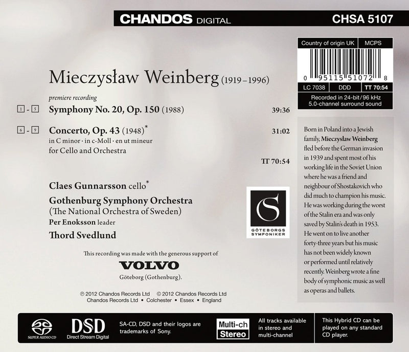 ChandosWeinberg: Cello Concerto; Symphony No. 20 / Svedlund, Gunnarsson, Gothenburg Symphony Orchestra