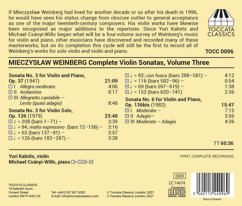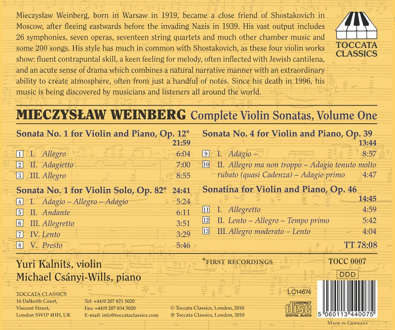 Violinist Yuri Kalnits and Michael Csányi-Wills recorded their program of violin music by the Russian composer Mieczys?aw Weinberg in two sessions: August 26–30, 2008, at Champs Hill, Coldwaltham (Sonata No. 1, Sonata No. 4, and the Sonatina), and July 13–18, 2009, at Moviefonics Studio in West London (the solo sonata). This constitutes the first volume in what will apparently be a complete set of the composer’s violin sonatas. Toccata bills the recordings of the First Sonata and the solo sonata as recording premieres.