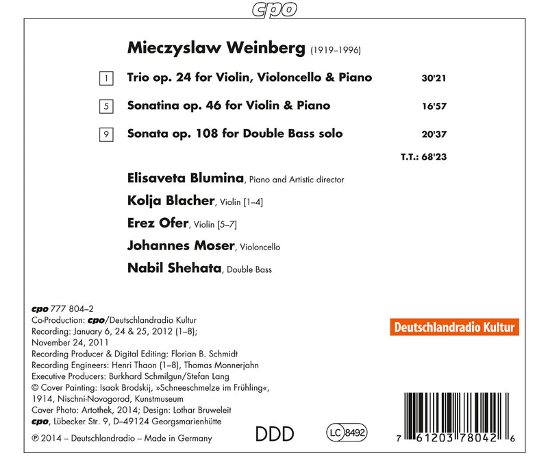 WEINBERG Piano Trio. 1,2,4 Sonatina for Violin and Piano. 1,3 Sonata for Solo Bass 5 • 1 Elisaveta Blumina (pn); 2 Kolja Blacher (vn); 3 Erez Ofer (vn); 4 Johannes Moser (vc); 5 Nabil Shehata (db) • CPO 777804-2 (68:23)