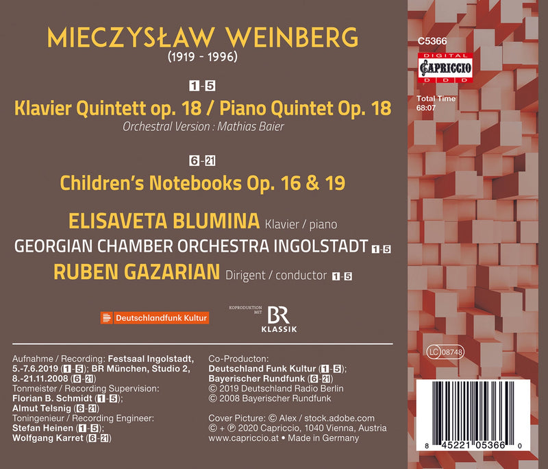 CapriccioWeinberg: Piano Quintet (Orchestral Version) - Children's Notebooks, Books 1 & 2 / Elisaveta Blumina, Ingolstadt Georgian Chamber OrchestraFive years after Shostakovich premiered his quintet to turbulent success in 1940, his new 24-years young friend Weinberg premiered one of his... $21.99October 02, 2020